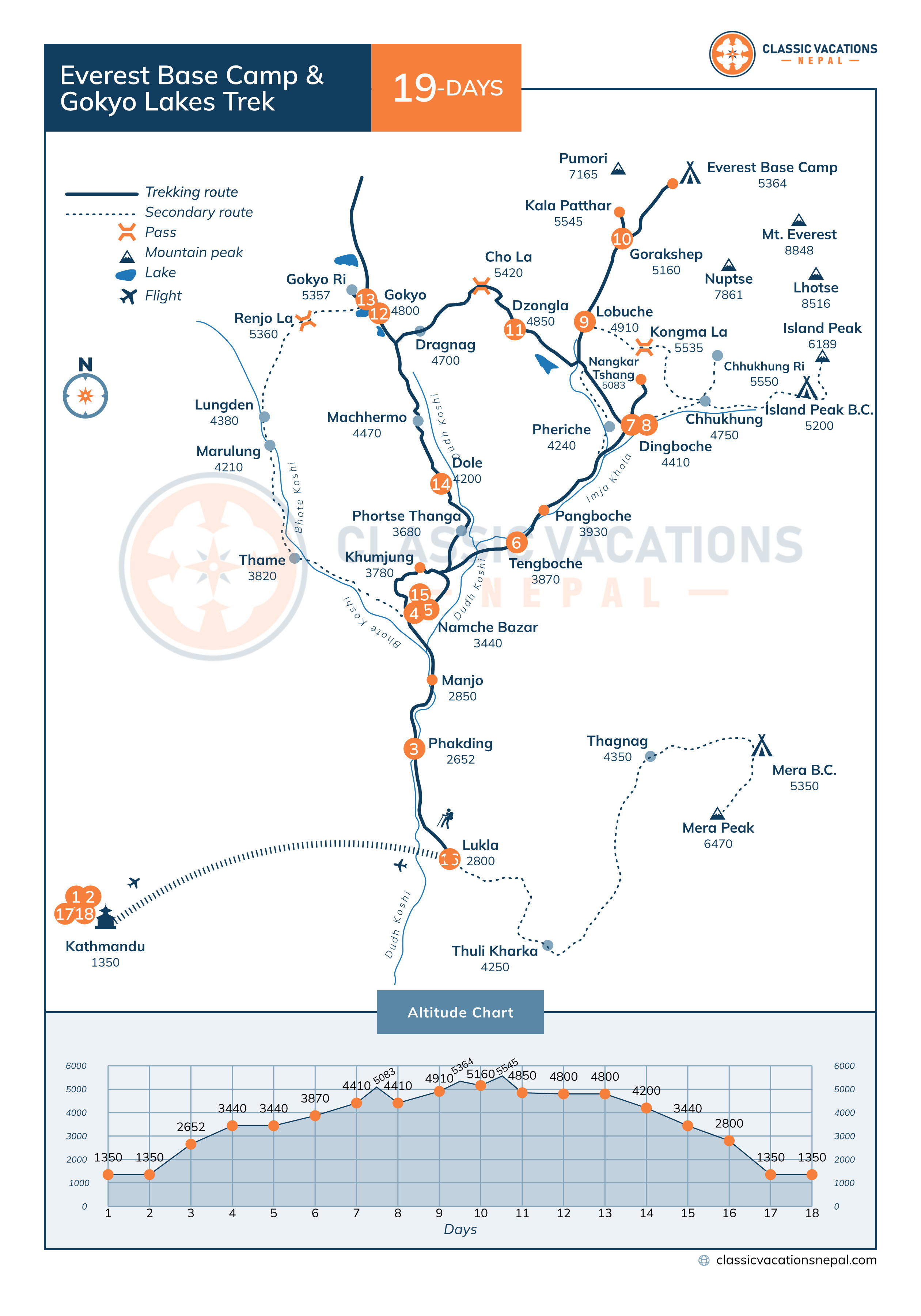 Everest Base Camp & Gokyo Trek combines two incredible himalayan valleys trekking in Everest Region- Everest Base Camp Valley & Gokyo Valley. Major highlights of this trek is, visit to Everest Base Camp (5364m), Incredible view of Mt. Everest from Kalapathar (5545m), challenging but exciting high altitude Chola Pass (5350m), beautiful Gokyo Valley (4800m), Gokyo Ri view point (5357m) & tranquil Gokyo Lakes and Ngozumpa Glacier. No doubt, Everest Base Camp & Gokyo Lake Trek is adventurous and one of the best trekking destinations in the entire Khumbu region. Gokyo Valley is famous for beautiful tranquil lakes in the region, including fourth lakes and fifth lakes valley, and massive Ngozumpa Glacier.