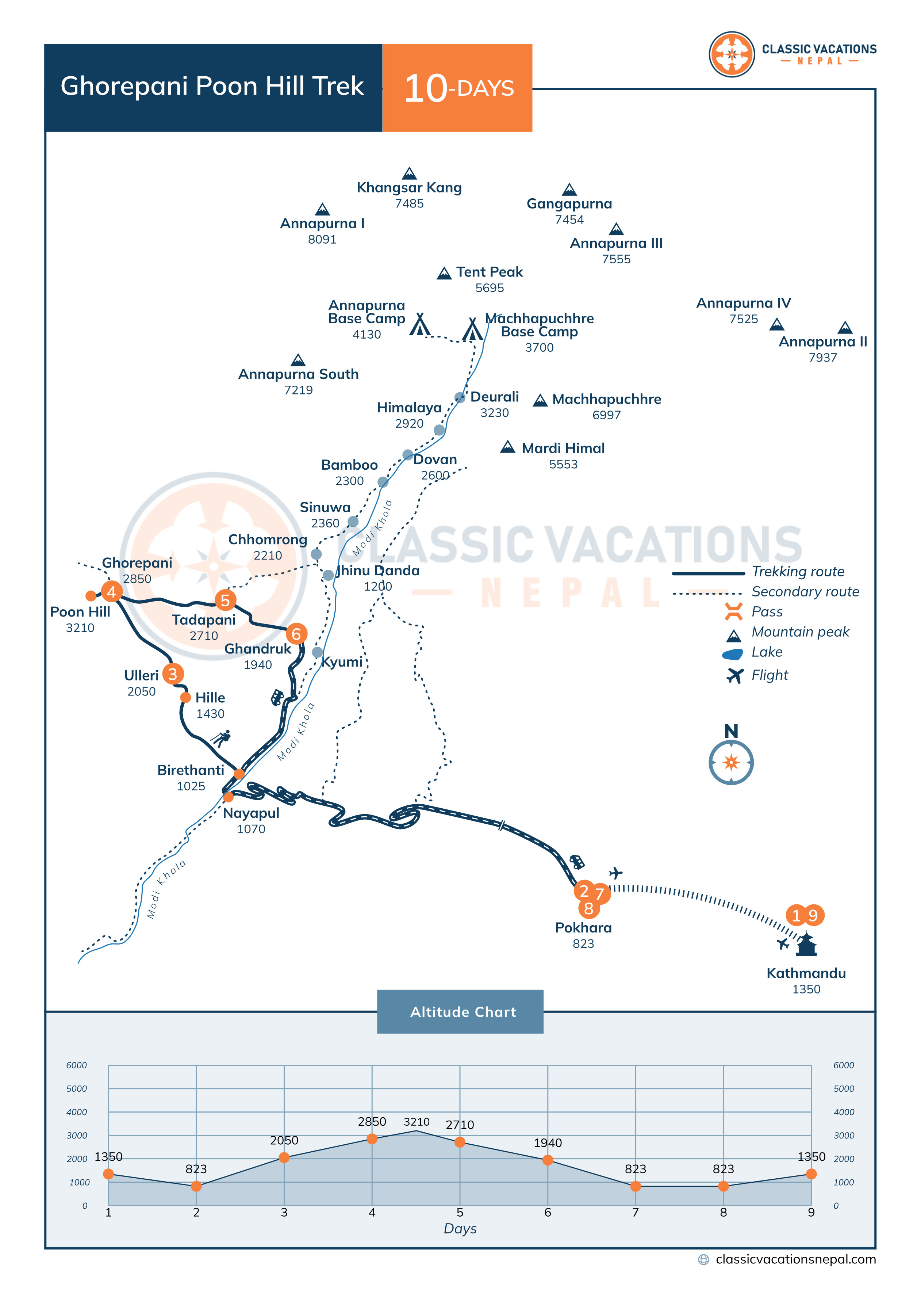 This trek is pleasant but has lots of uphill and downhill walking every day. Average walking is 4 to 6 hours a day, and the highest point is only 3200m at Poon Hill. Every other day the walk will be between 2000m- 3000m in altitude so this trek has no risk of high altitude sickness.