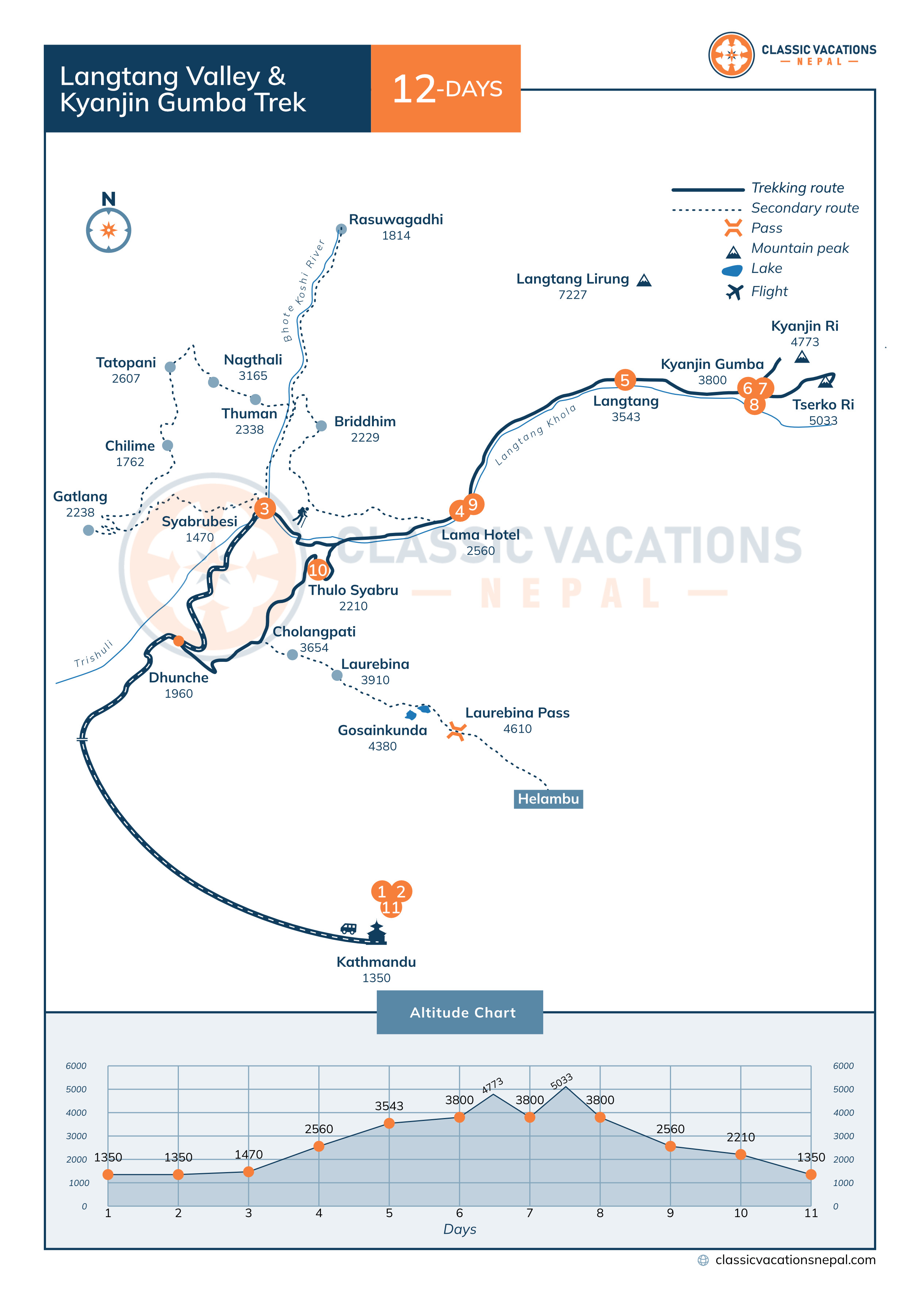 The trek typically takes 7 to 13 days, depending on your pace and side trips like Kyanjin Ri or Tserko Ri.